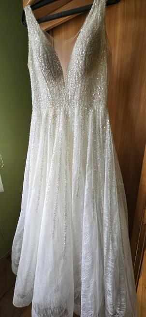 Sprzedam suknię ślubną kupioną w 2023 r w salonie ślubnym.Dlugość calkowita 143 cm, rozmiar 40, talia 2×41 ...